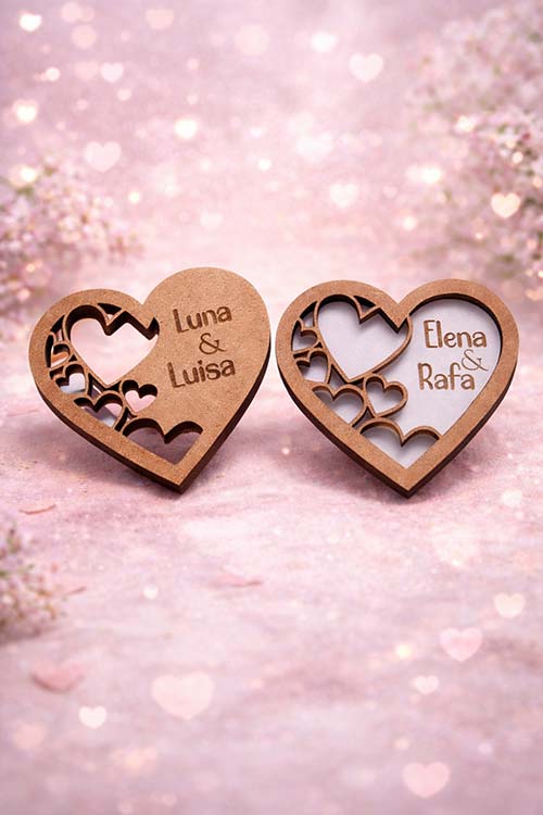 Imanes de corazón personalizados con nombres, hechos en madera.
