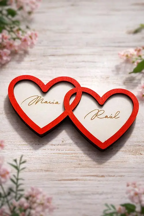 Nuestros imanes del Día de los Enamorados están diseñados como un pequeño detalle con mucho significado. Con forma de corazón y personalizados con nombres, son ideales para sorprender con un regalo sencillo, cercano y hecho a medida.