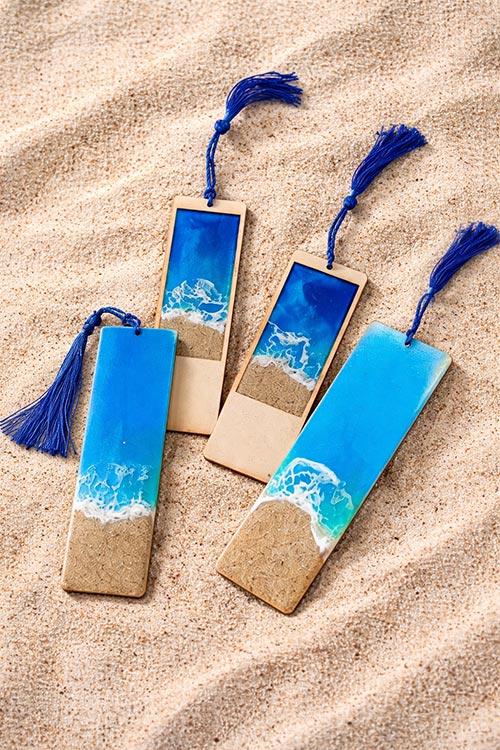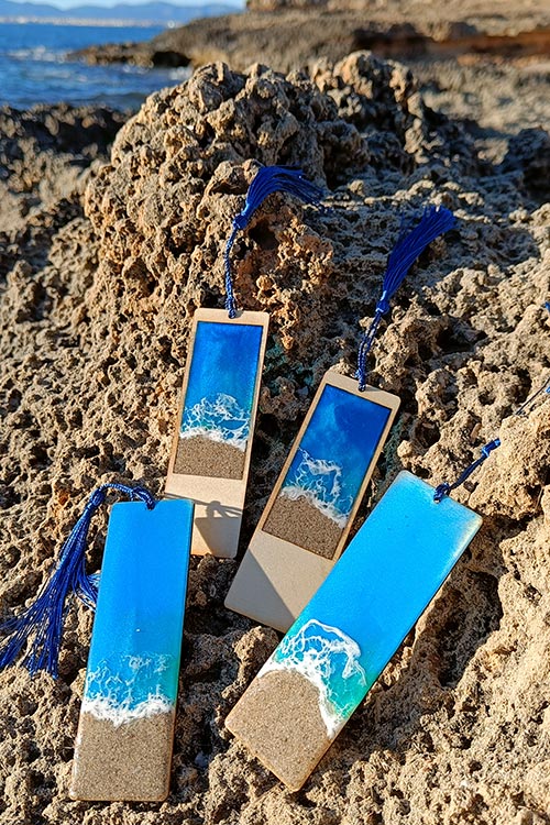 Nuestros puntos de libro “Marina” están elaborados artesanalmente con madera y resina, recreando una pequeña escena costera con arena y efecto de ola. Cada pieza es única, ya que el movimiento de la resina nunca se repite exactamente igual.